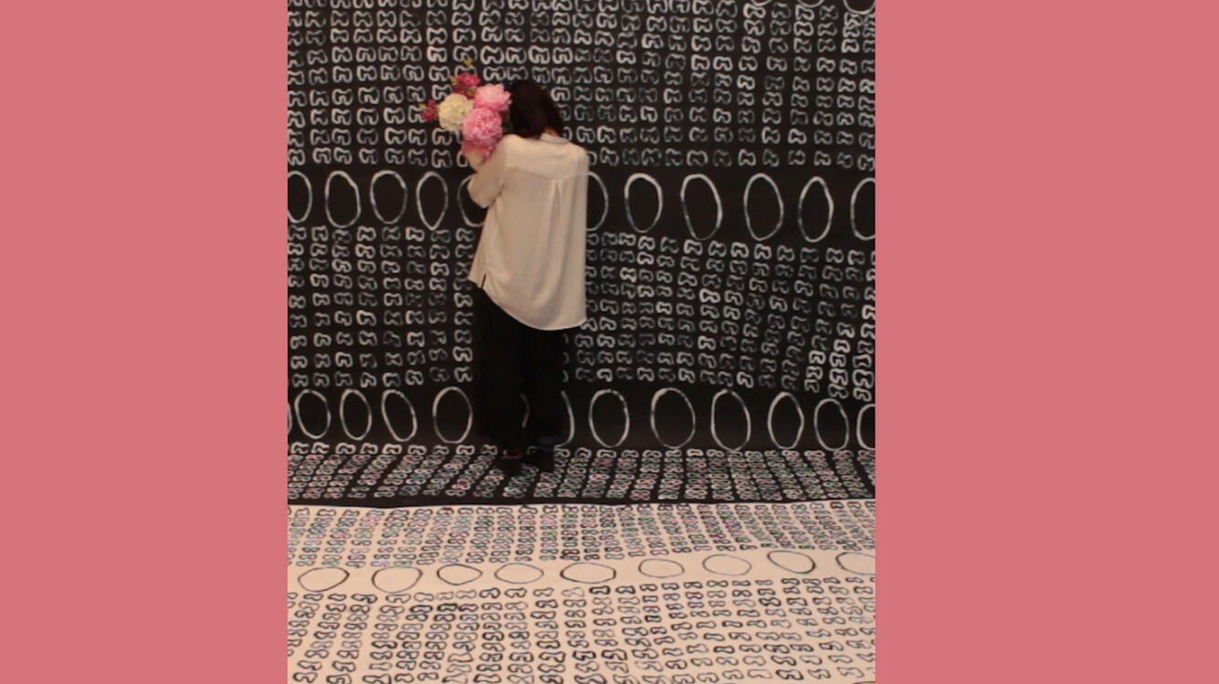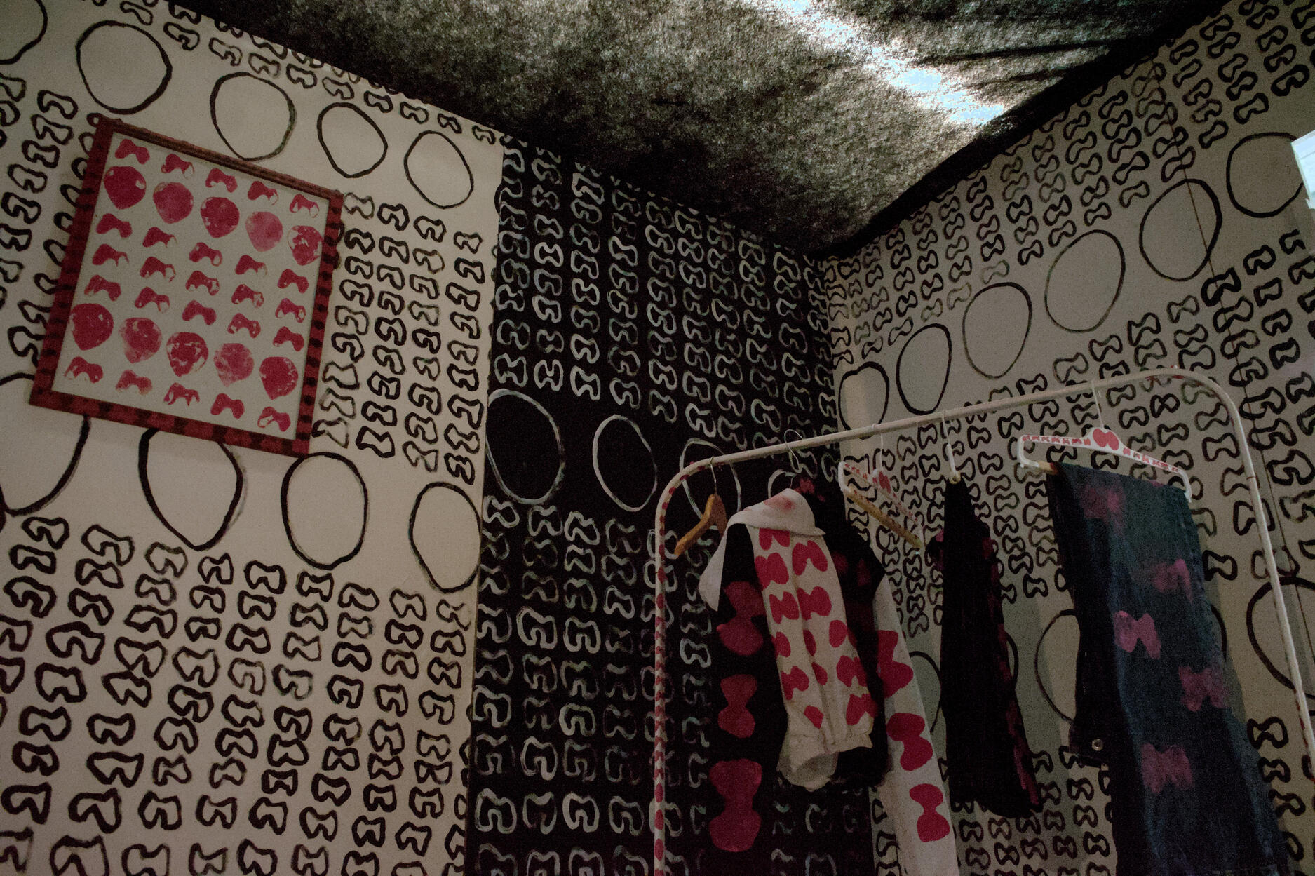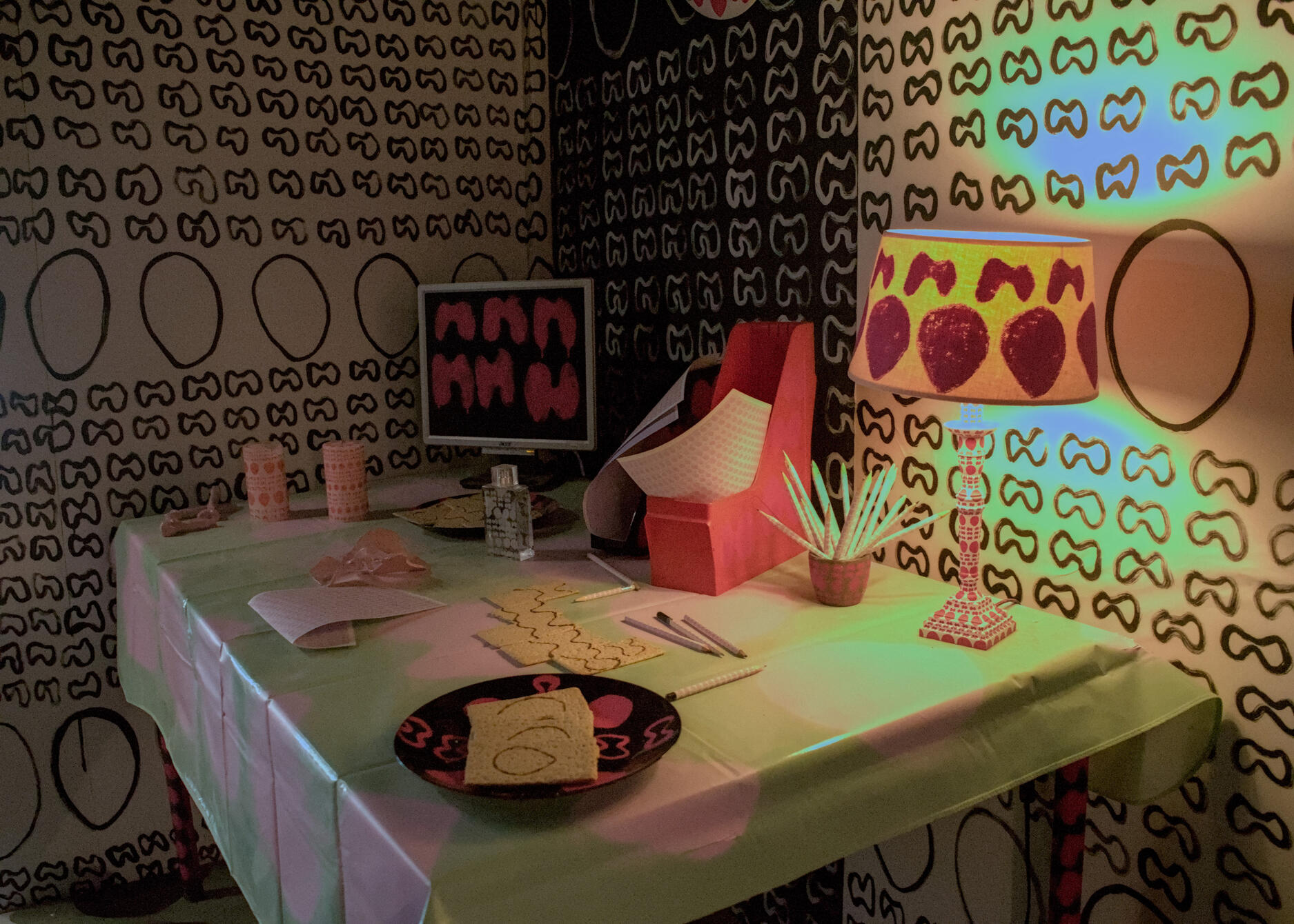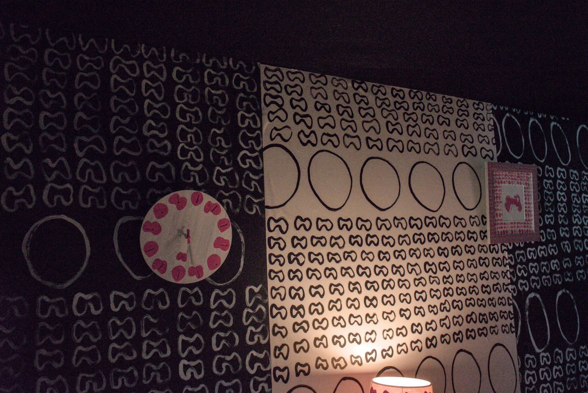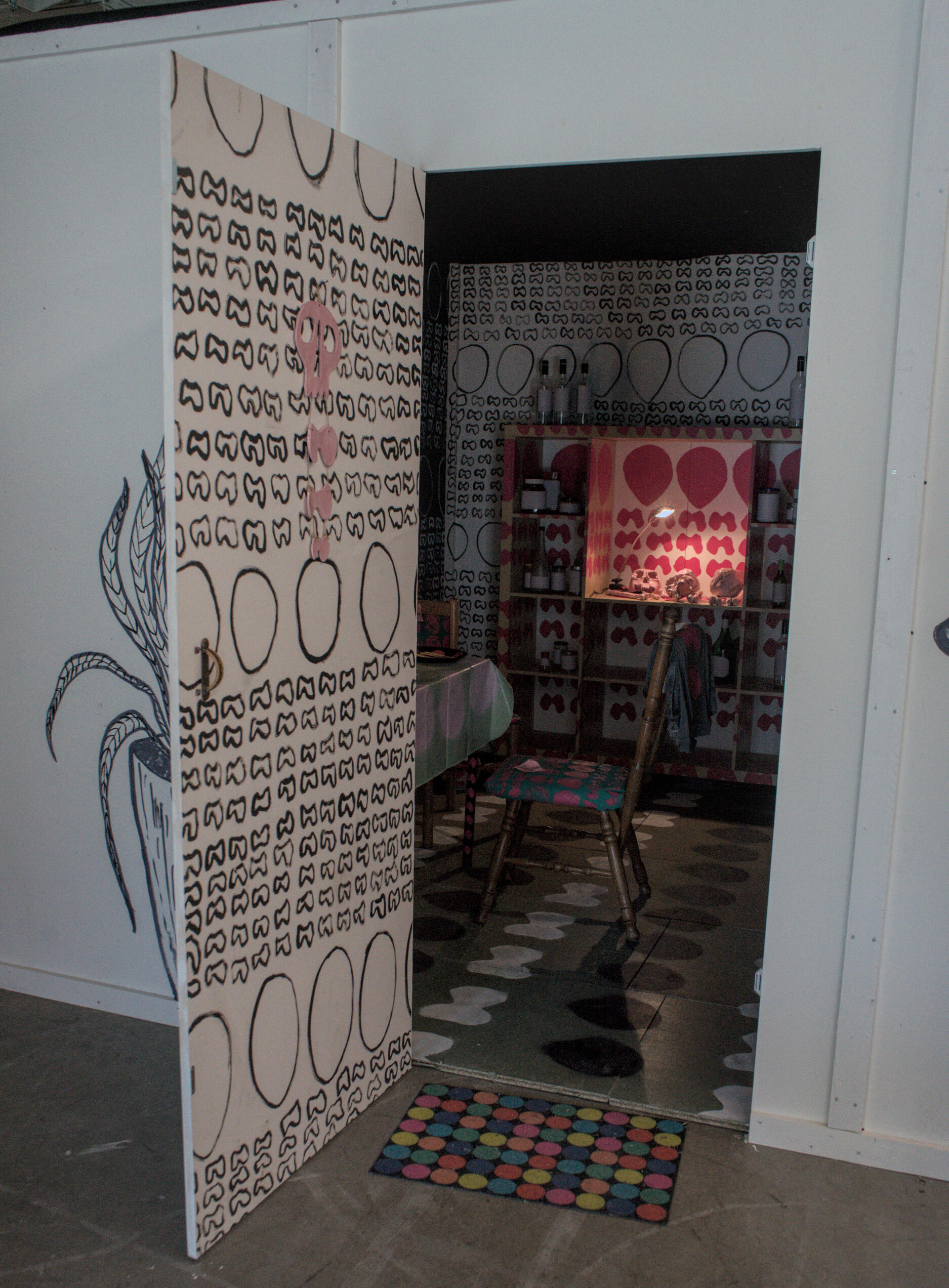 clear ridicule of the pattern (with pink, childish resembling symbols) on everyday objects that would fill a space.A room everybody can sit in for as long as they would