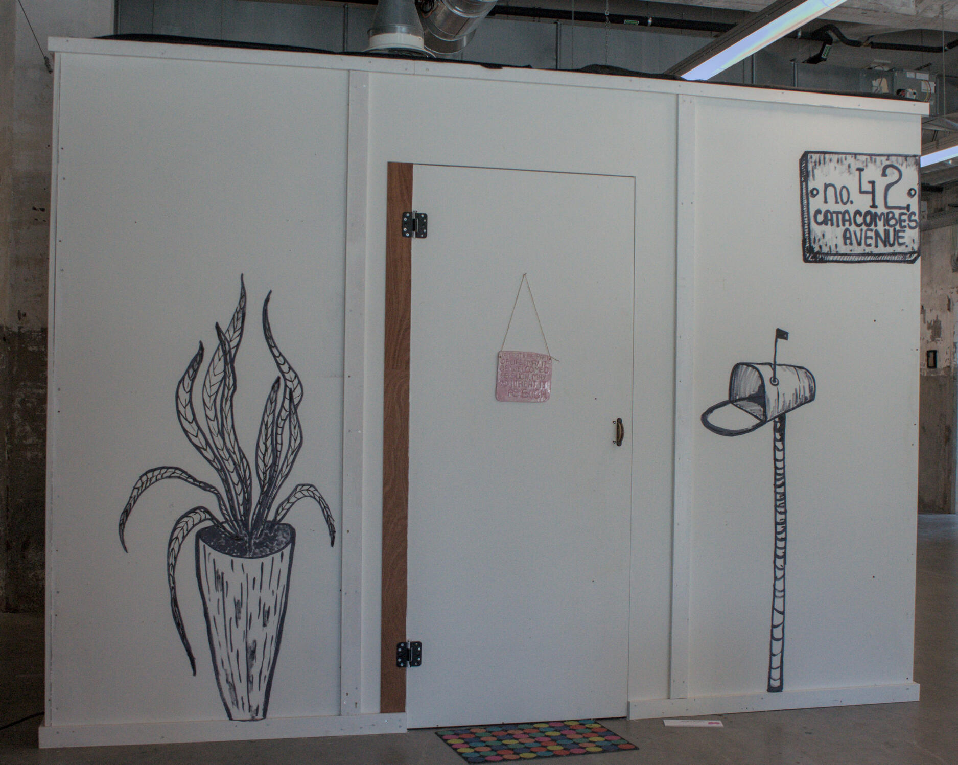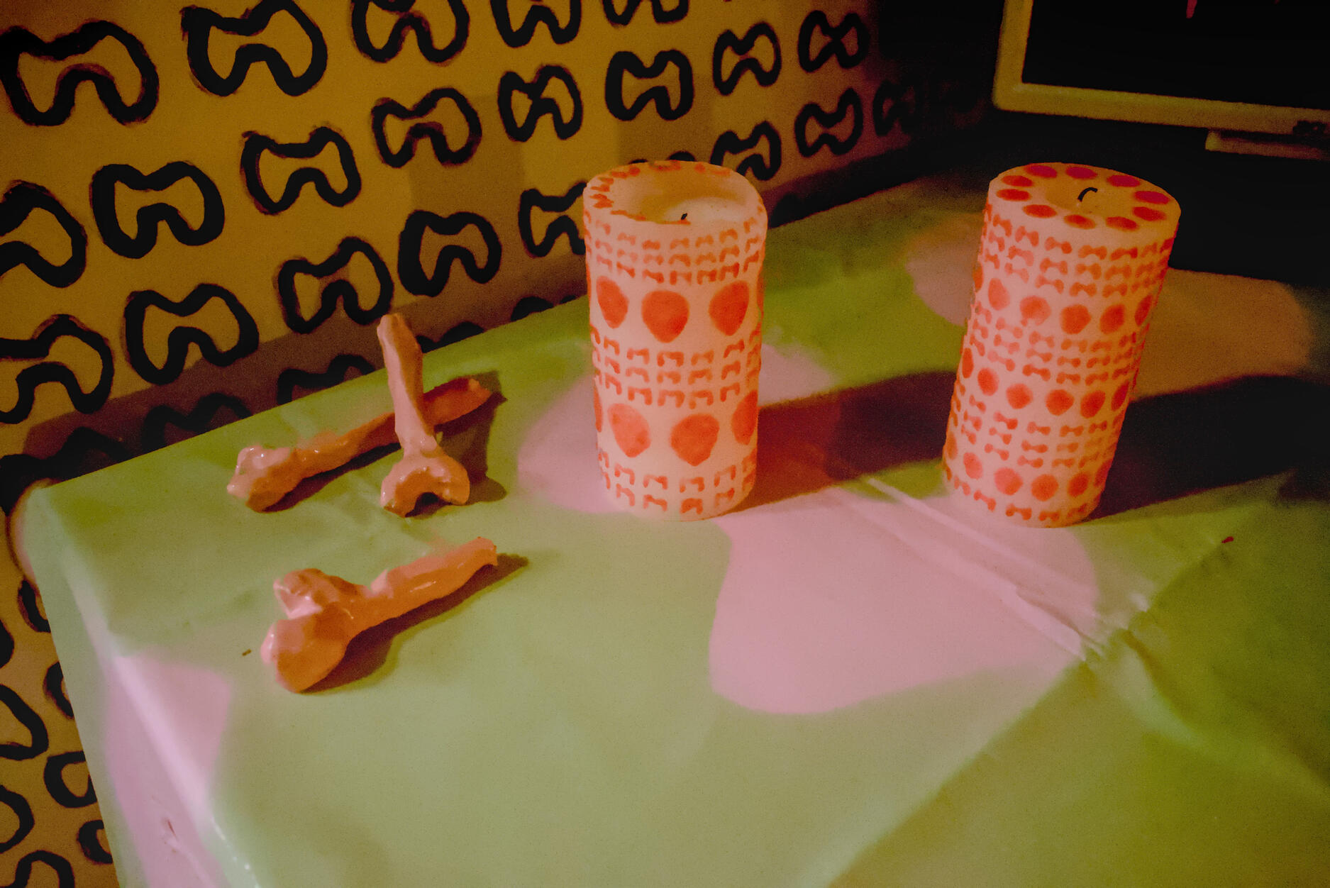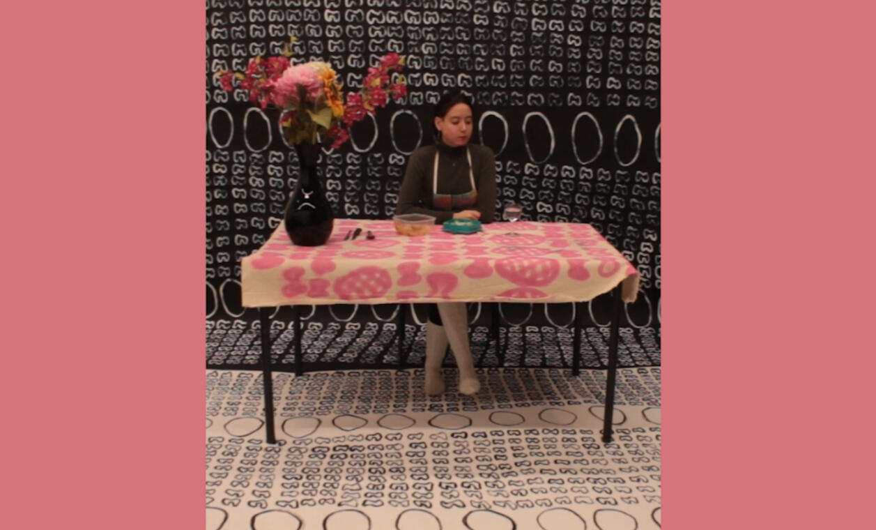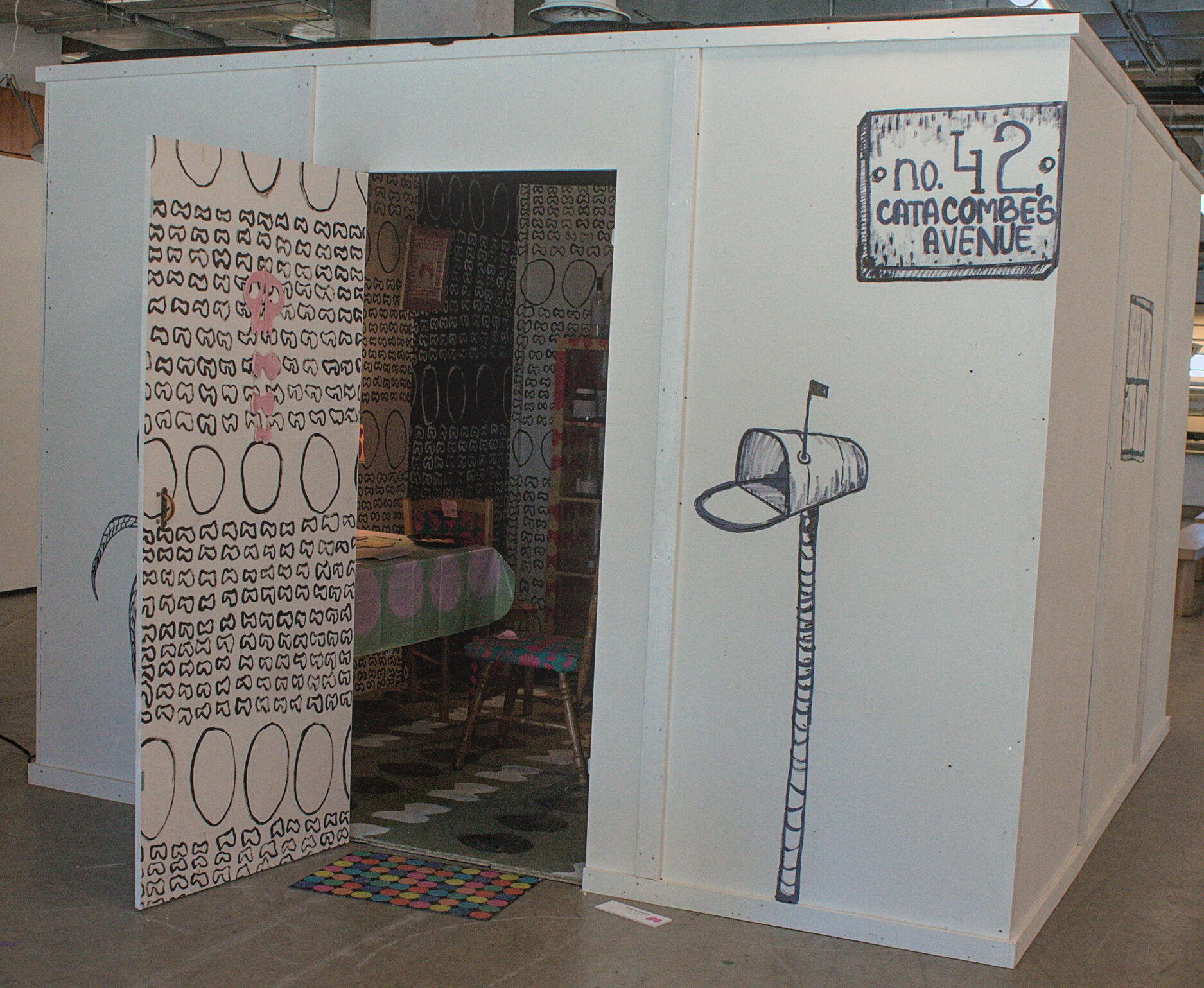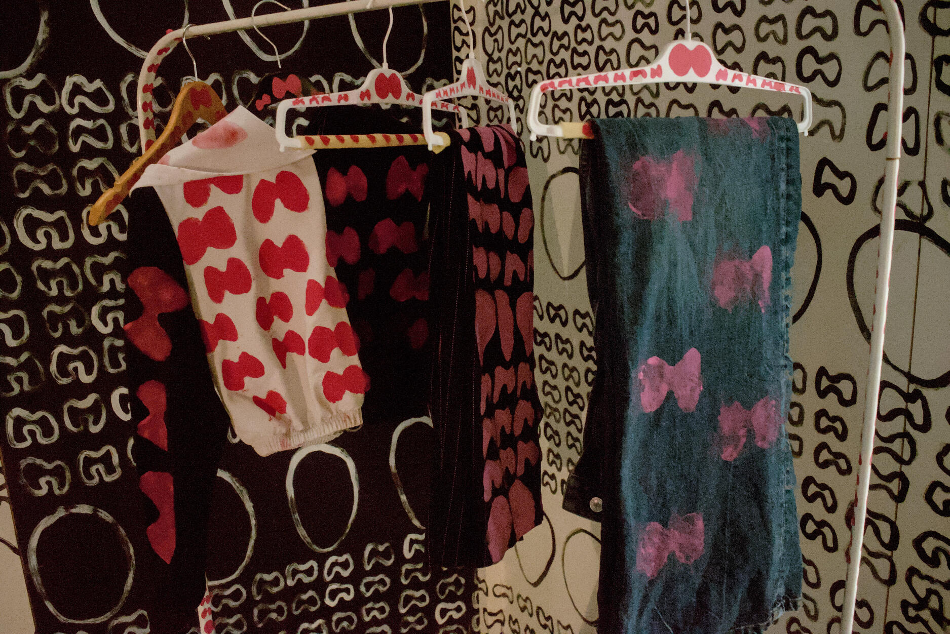 clear ridicule of the pattern (with pink, childish resembling symbols) on everyday objects that would fill a space.A room everybody can sit in for as long as they would