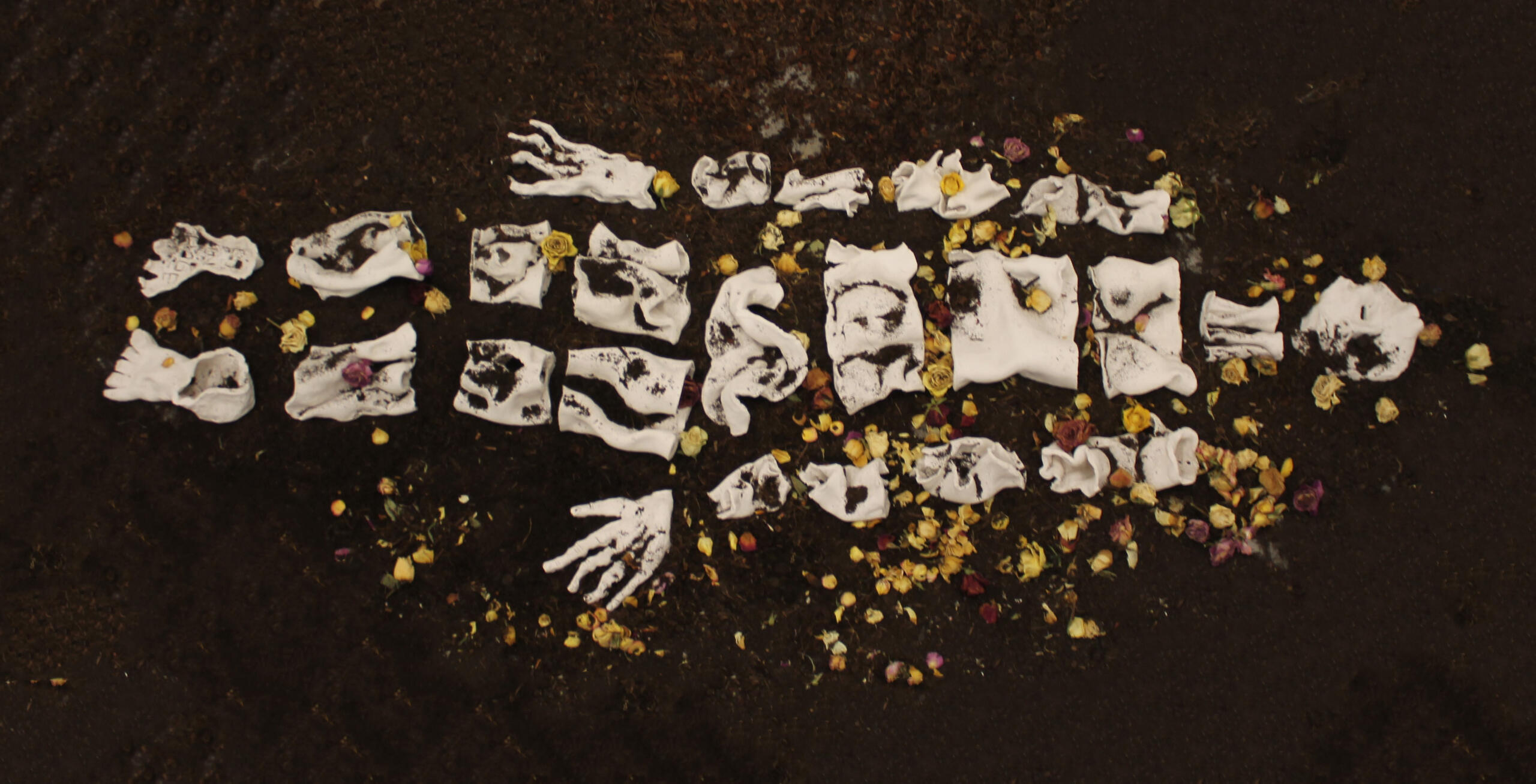 “DIGGING MY OWN GRAVE” (2021-2022) - sculpture, burned ceramics on earth and rose petals, 200cm